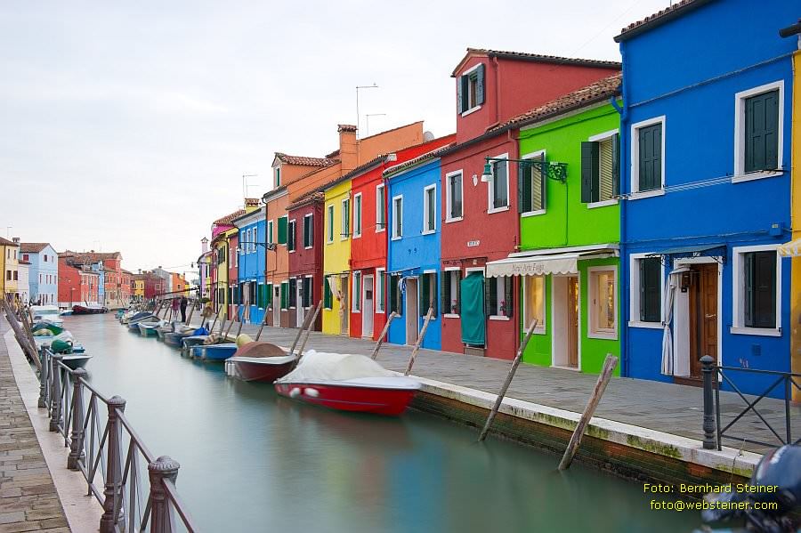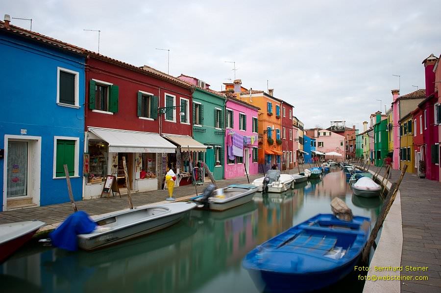 Typisch für Burano sind die vielen kleinen in jeweils einer zu den Nachbarhäusern kontrastierenden kräftigen Farbe gestrichenen Fischerhäuser, die sich in den Kanälen spiegeln und die die Individualität der jeweiligen Hausbesitzer betonen. Die kuriose Farbenpracht zieht viele Maler und Fotografen auf die Insel.